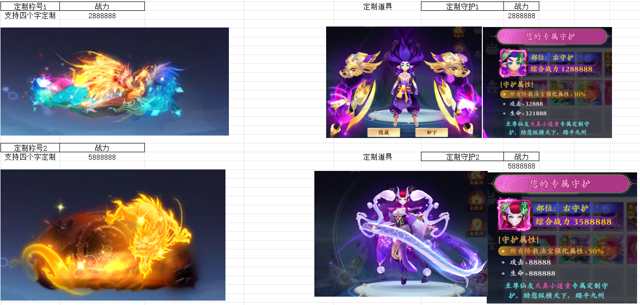 | 20000 | 法宝定制守护2 | 888万战力 六字定制称号 | 神迹神丹*9 | 摄魂琥珀*499 | 仙职令*1000 |