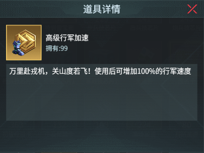 高级行军加速用于在关键时间争取先手和救援有着关键作用,抢先点火,例如抢司令官,抢黄金城。