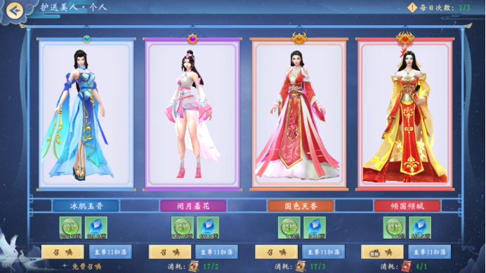 4、护送美人:押运协助美人达到目的地可获取大量经验,每日有三次机会,四个形态可以召唤获取的经验也是逐步提升。