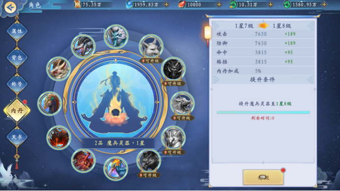 3、内丹:通过时间获取进行升级次数,提升战力以及属性。