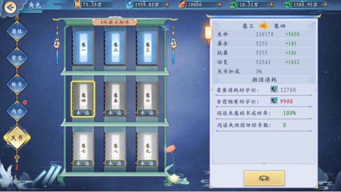 4、天书:通过日常任务获取的学识进行升级提升战力以及属性。
