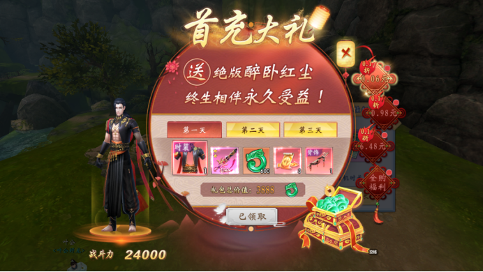 1、进入游戏后首充界面可获取绝版时装、宠物以及套装对前期过度有着很大的提升。
