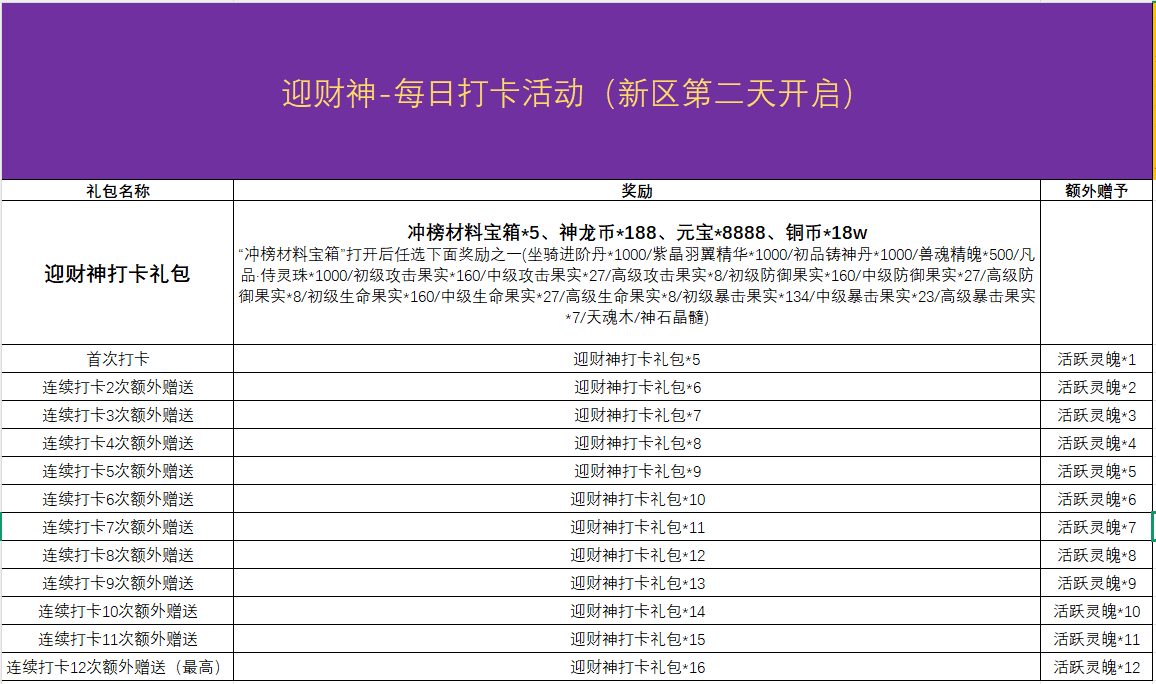 1、开服第二天开始计算玩家充值198财神直购,参与百万灵玉瓜分,并线下领取打卡财神礼包;