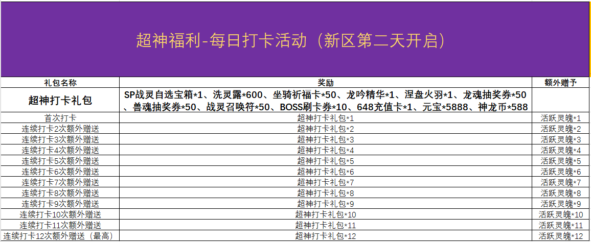 1、开服第二天开始计算玩家充值648元,即可参与领取打卡超神礼包;