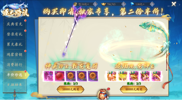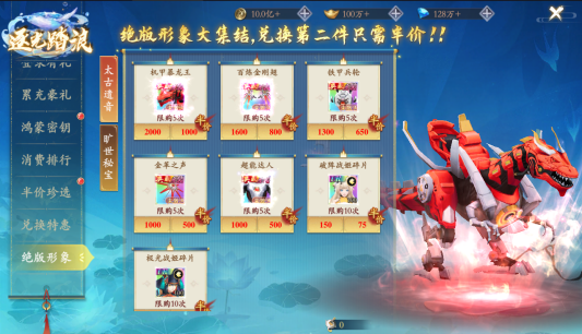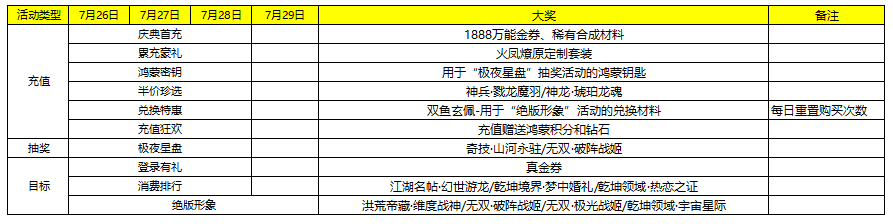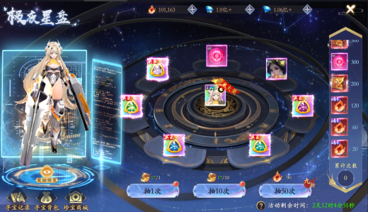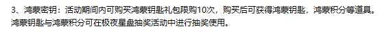 7、极夜星盘:活动期间内使用鸿蒙钥匙以及鸿蒙积分进行抽奖,可获得丹药,升级材料,图鉴以及大奖奇技·山河永驻和无双·破阵战姬。