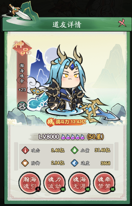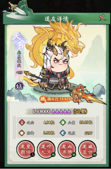 被动技能3:战斗中生命首次低于30%时,立即获得100点怒气,战斗中永久增加120%攻击、120%防御、120点速度,且攻击后恢复造成伤害50%的生命至战斗结束
