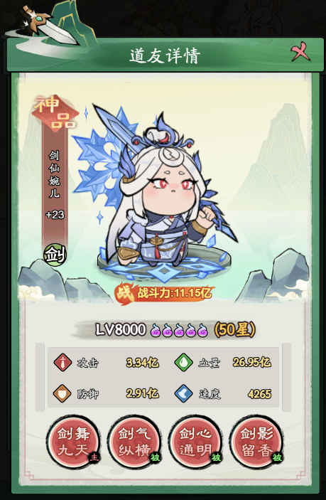 被动技能3:自身死亡时,有50%的概率使全体敌方单位冰冻2回合,并恢复全体友方单位剑仙婉儿400%攻击的等量生命