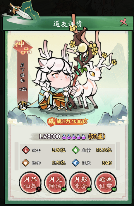 主动技能:对全体敌方单位造成80%攻击伤害,并恢复生命值最低的友方单位月下瑶仙攻击力350%的等量生命,同时有40%的概率使一个敌方单位眩晕2回合