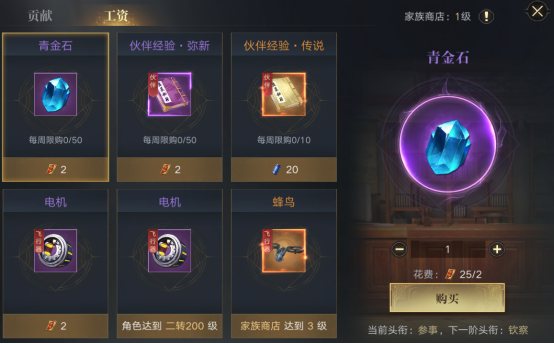 家族商店中可购买的商品根据消耗货币分为两类:家族贡献和工资,家族商店等级提升后将逐渐开放更多道具。