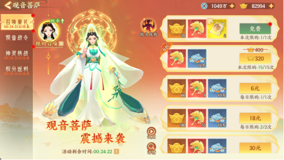 在第一周【齐天大圣】的专属活动结束后,游戏第二周将会陆续开启80资质神灵【观音】和【黄帝】的专属活动