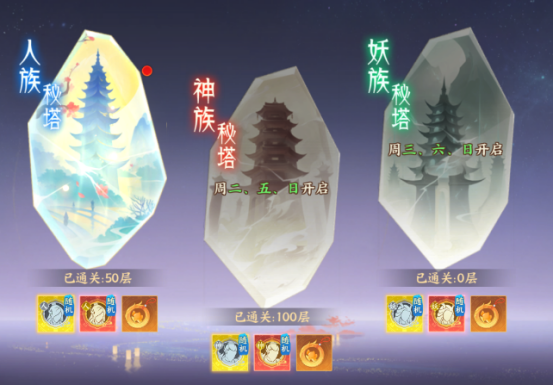 种族塔分为【人族】【神族】【妖族】三个类型的关卡,每周根据日期开启