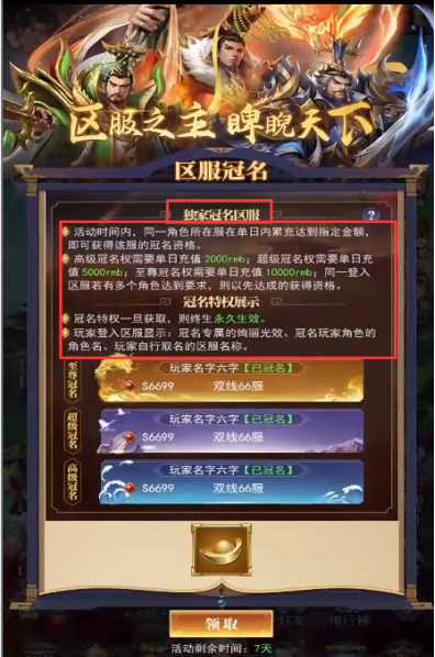 | 3)该登入区服的冠名权过期后一周后,如需重新冠名则需按照日充要求增加实现 | |