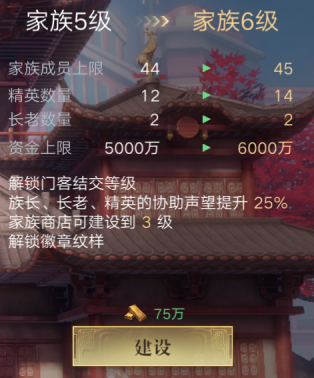 大厅升级可以提高家族成员上限、精英数量、长老数量、资金上限、家族商店建设等级,解锁新功能,额外声望等,升级带来的帮助是非常可观的。