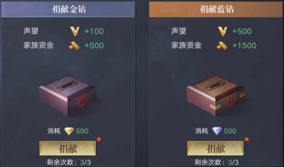 捐献500蓝钻,获得500点声望,增加1500家族资金。