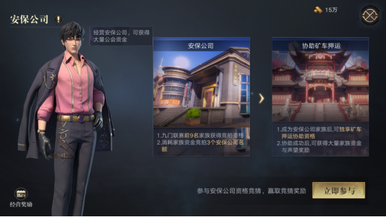 获取资格:九门联赛前9名家族获得竞拍资格,消耗家族资金竞拍3个安保公司名额。