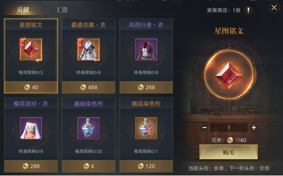 家族商店中可购买的商品根据消耗货币分为两类:家族贡献和工资,家族商店等级提升后将逐渐开放更多道具。