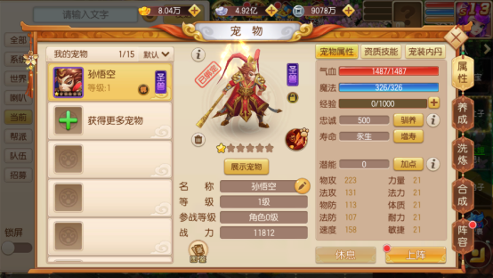 玩家可携带宠物一同进入战斗,除主角携带的主宠外,每多上阵1只侍从,可同时多上阵1只侍宠(前提宠物上阵格子位开启,主角85级5个全开)。主宠可在战斗中通过召唤更换,侍宠死亡后无法再召唤。宠物在战斗中起着很大的作用,所以培养宠物很有必要。