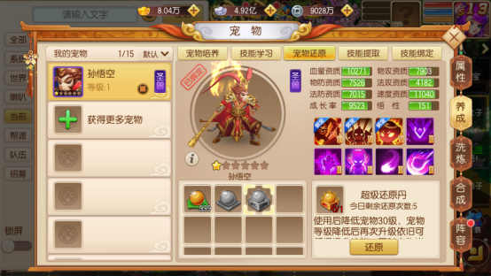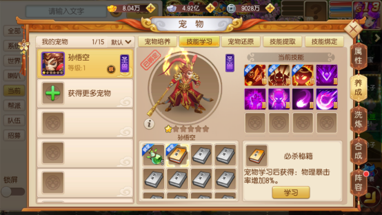 这里说明的技能为宠物初始技能和打书技能,不含突破技能(突破技能见下文)。合理改造宠物技能能大大提升宠物面板属性和战斗能力。