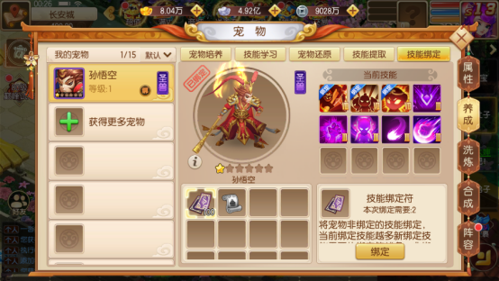 技能绑定:宠物技能可使用绑定符绑定,这样可以避免打书时顶掉目标技能。当前绑定技能数量越多需要绑定符越多,另外不绑定技能至少保留3个。如已绑定的技能不需要,只需要1张解绑符即可解绑,再打书顶掉。