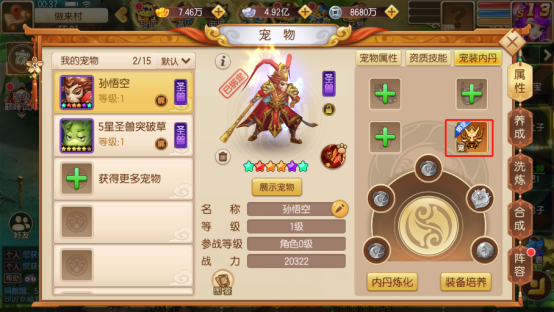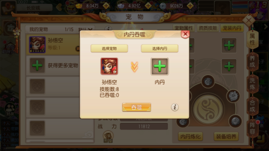 宠物内丹:宠物内丹是对技能终极升级的操作,宠物的8级通用技能/特殊技能/专属主动技能可通过吞噬内丹继续升级提升。内丹可通过炼化多余的宠物获得,获得概率和宠物的类型、星级、成长挂钩。