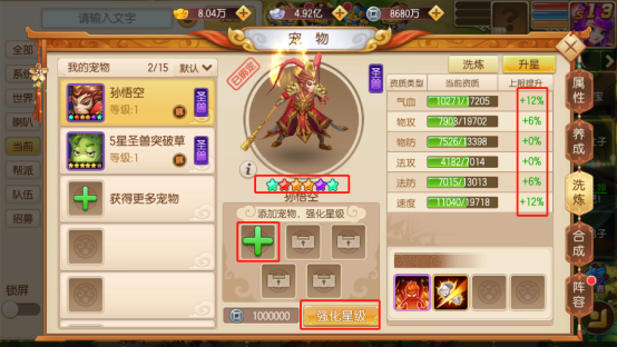 洗彩星:宠物6星后,可继续吞噬同品质5星宠物洗星(星级强化),宠物的6颗星会变成彩色,洗星能随机增加资质上限,可无限洗,但洗星资质为替换型,非累加型,最高加36%。