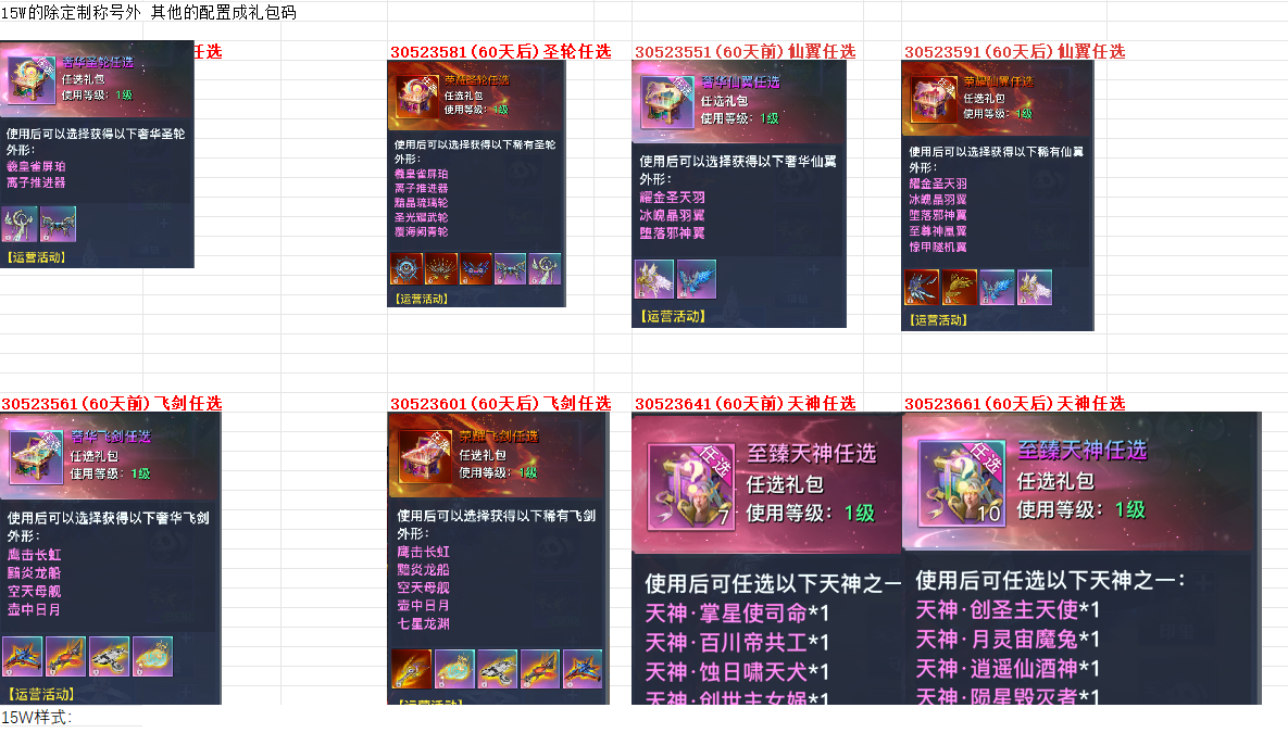 | 至尊豪礼·二 | 450000 | 30523561(60天前)/30523601(60天后)飞剑任选 | 1 | 34740010_寻龙密钥【绑】【红】【1星】 | 150 | 34840030_天龙神石【绑】【红】【3星】 | 4 | 34810030_高级甲灵玉【绑】【红】【3星】 | 8 | 30610010_金柳仙露【绑】【紫】【1星】 | 600 | 500 |